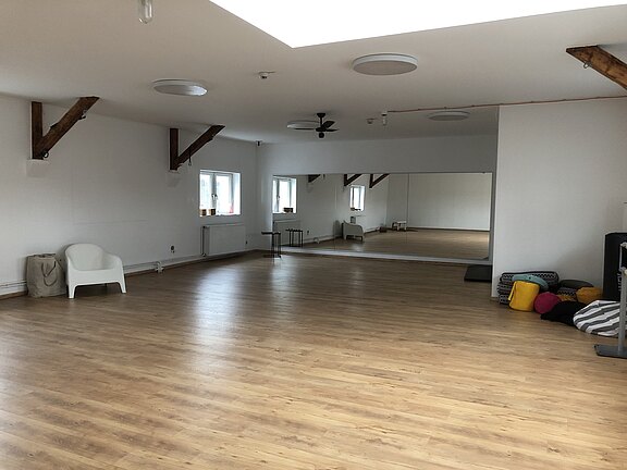 Auf den Parkplatz fahren, ganz nach hinten durchgehen und auf der rechten Seite zum Bewegungsraum abbiegen.
